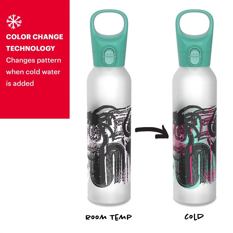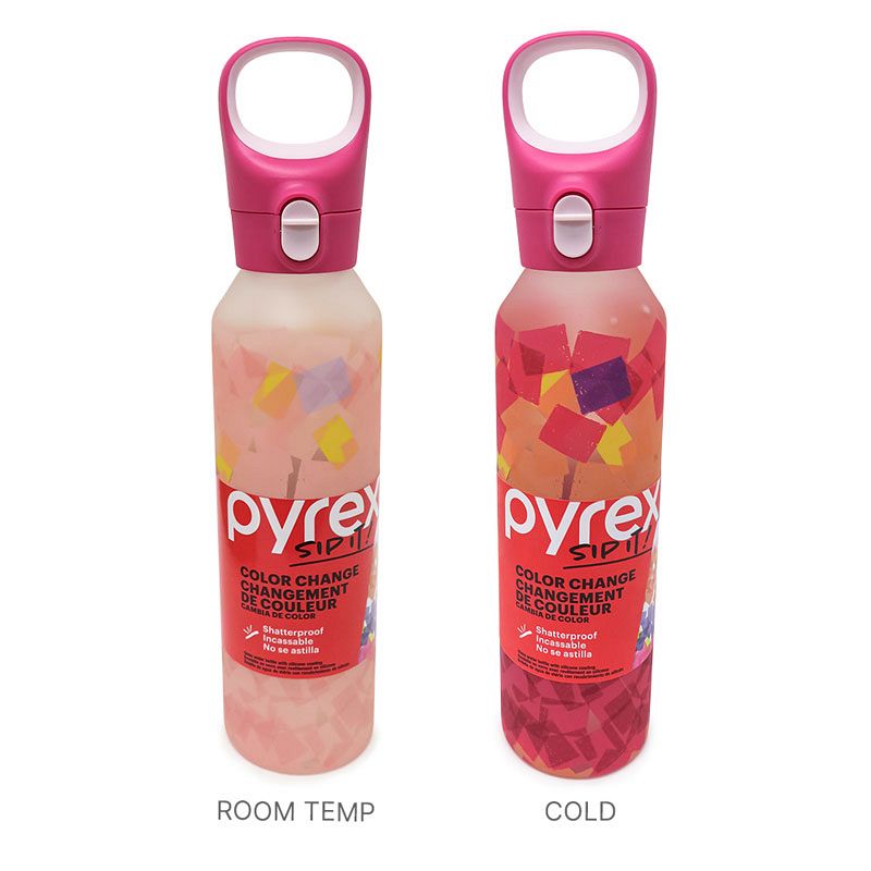 The pattern on this colorful water bottle changes when you add cold water. Plus it's leakproof and shatterproof! This colorful glass water bottle uses innovative color change technology in the 5-layer silicone coating that reveals more of the design when you add cold water. The bottle is shatterproof, leakproof and sweatproof as well as replaces single-use bottles, so it's environmentally friendly. Inside is pure Pyrex glass you can trust to keep liquids tasting the way they should. It has a wide opening that's easy to fill and easy to clean and a flip-top lid with a handy carry handle. Skip wasteful plastic water containers with this fun, reusable bottle!