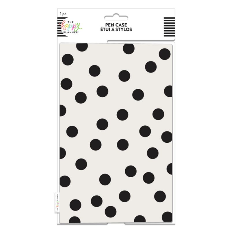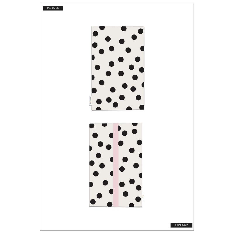 Keep all your planning necessities on hand. This canvas pouch features a polka dot print with a contrast pink band that wraps on your Happy Planner covers. The zip closure will keep your pens, sticky notes, and washi tape safe!