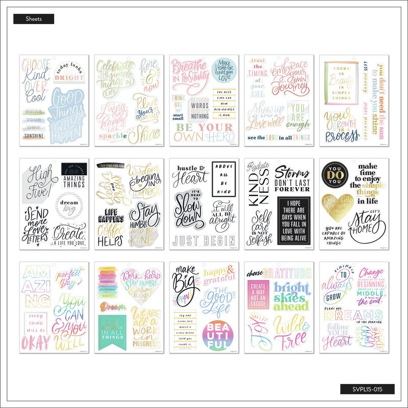 Always look on the bright side with these inspirational quotes. This must-have sticker book features large icon stickers with quotes for any occasion. These are great for Big size planners, scrapbooks, guided photo journals, and other DIY projects. It comes with 15 sheets and 73 inspirational quote with gold foil accents.