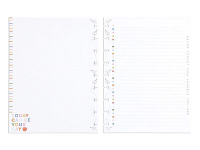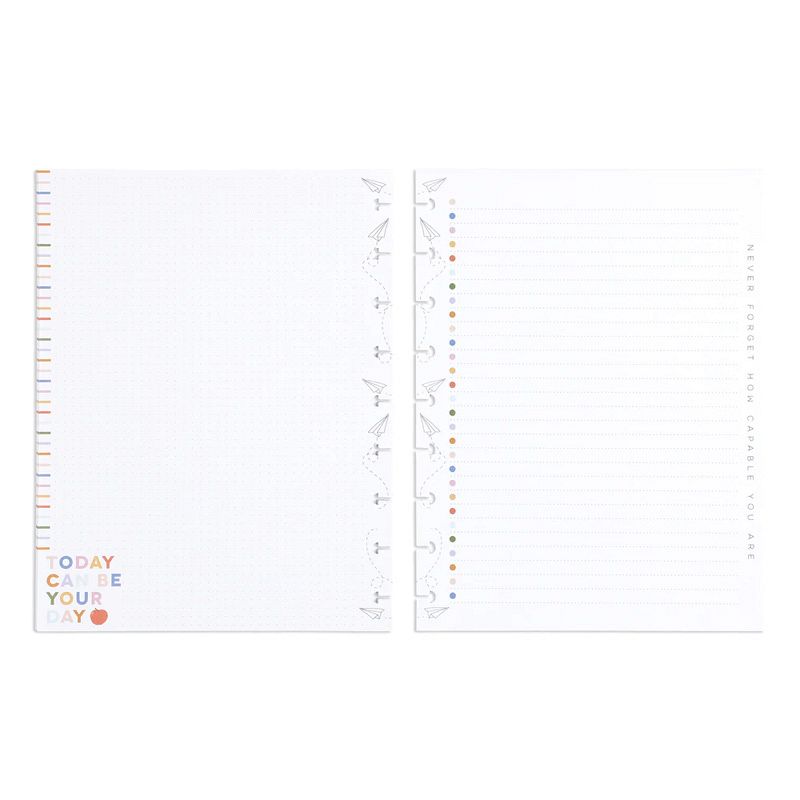 Today can be your day. This Classic size filler paper can easily be inserted into your Happy Planner disc bound system. This pack includes 40 sheets. The paper has a bullet list format on the front and dot grid pattern on the back.