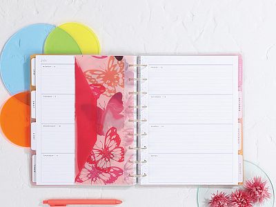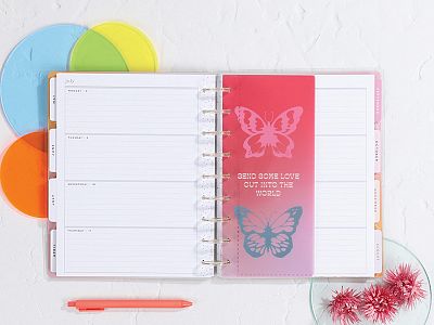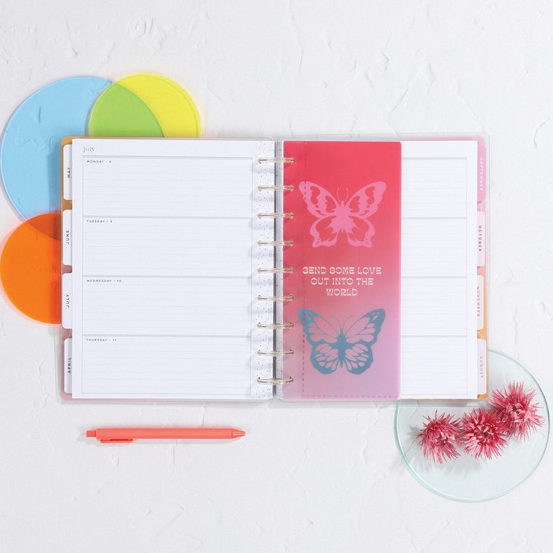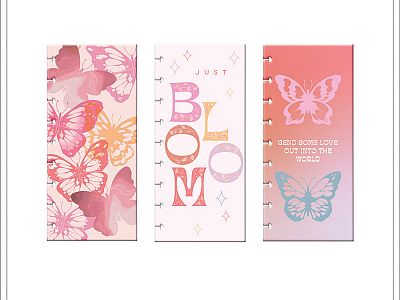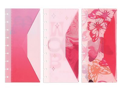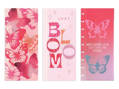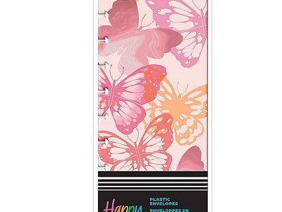 • Plastic snap-in envelopes with a warm color palette and butterfly graphics