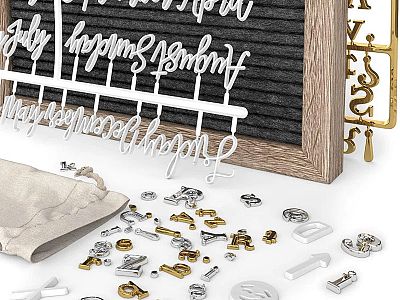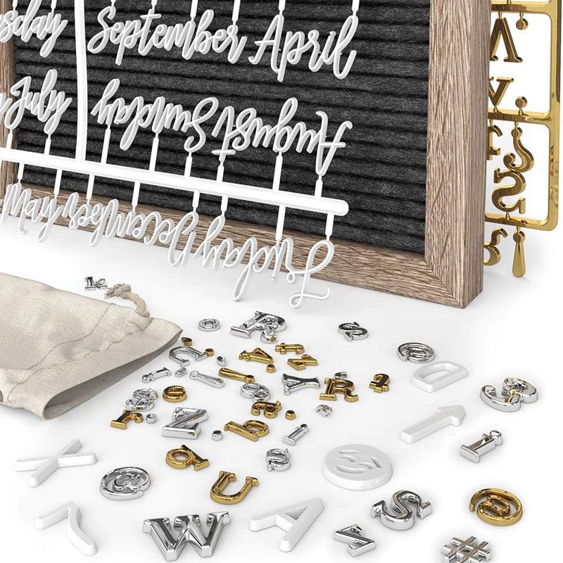 Includes, 176 White Letters, 125 White and 125 Gold Letters, 100 White Letters, 164 Symbols, and 33 Cursive Words, also comes with a wooden stand, canvas bag and scissors.