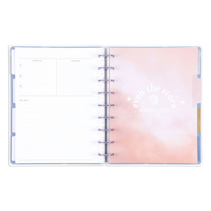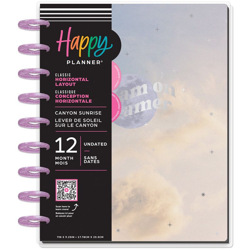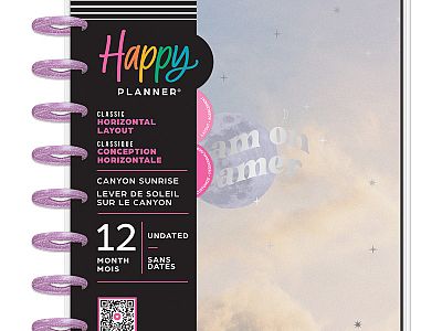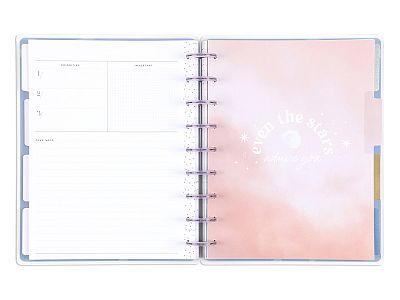 This undated Classic Happy Planner is for all our dreamers. The simple horizontal layout has daily lined box spaces where you will be able to write out important plans and priorities for the day. This 12 month undated planner allows you to choose your start and end date. We have included monthly stickers to label 12 dividers and get you started as you set your yearly goals. The designs features moons, stars, and themed quotes. Get lost in a daydream with artwork that reflect your love of everything heavenly. The hints of silver add magical enhancements to this shimmering planner.