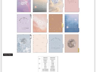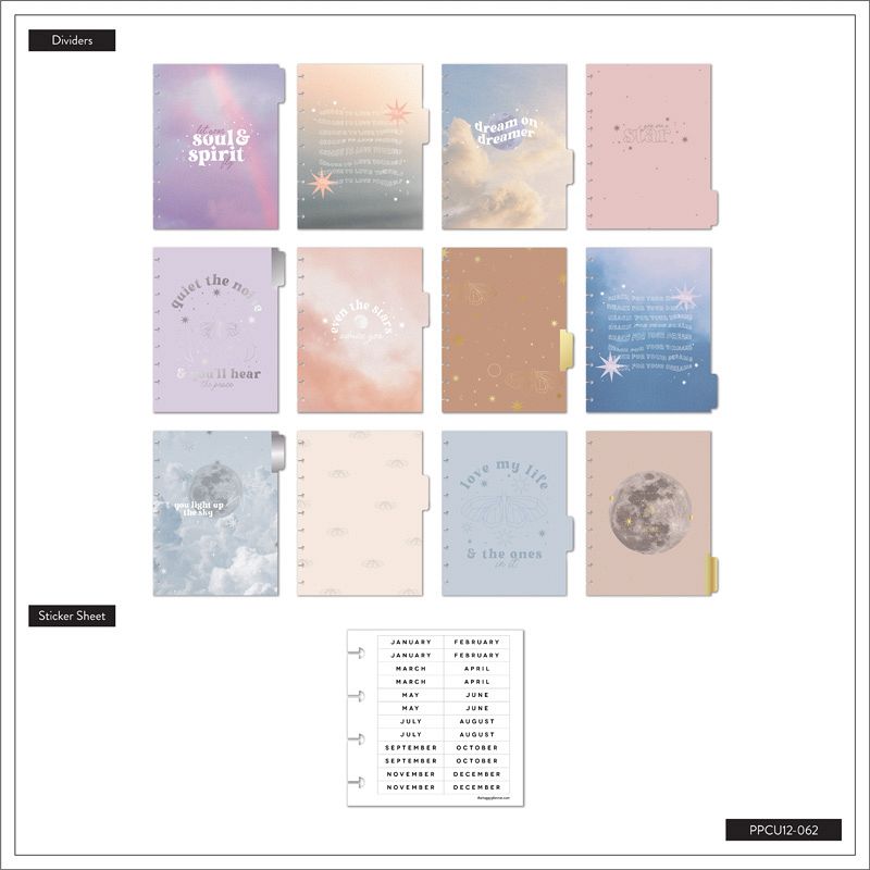 12 dividers are included with designs featuring celestial elements and metallic foil accents.