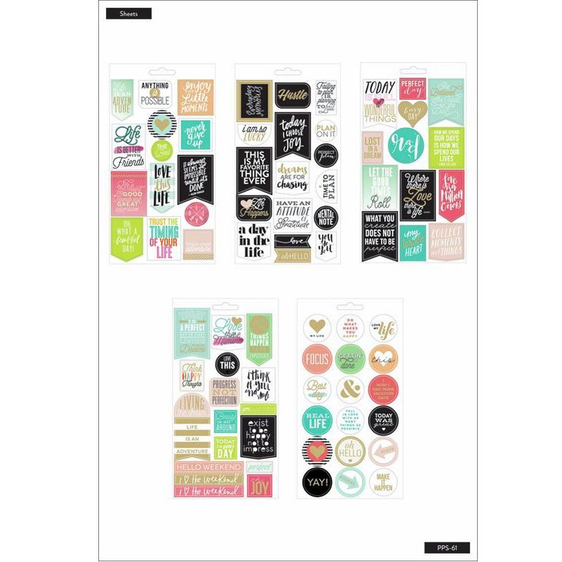 Nothing is easier than customizing your planner with stickers! This sticker book features stickers that were designed to empower and uplift you with inspirational sayings, and can be used anywhere in your Happy Planner¨. Each package includes 5 sheets of stickers (all sheets feature some gold foil) designed especially for planners.