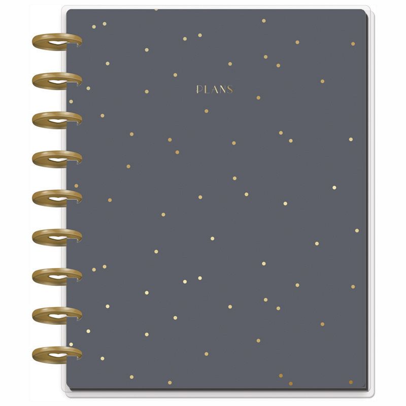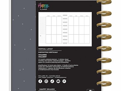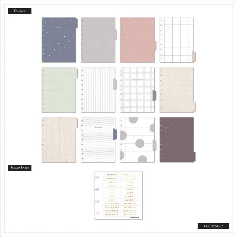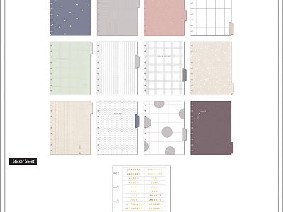 Plan your months through weeks and year with this Simple Essentials Happy Planner. This vertical layout contains 12 dividers with simplistic patterns and a light color scheme. Plan with stickers and accessories in a disc bound planner made for maximum customization. Turn busy into organized with our minimalist planner.
