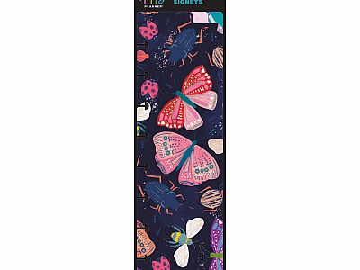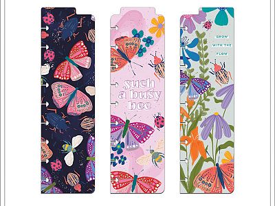3 plastic bookmarks with floral patterns and artistic insects found in a garden.