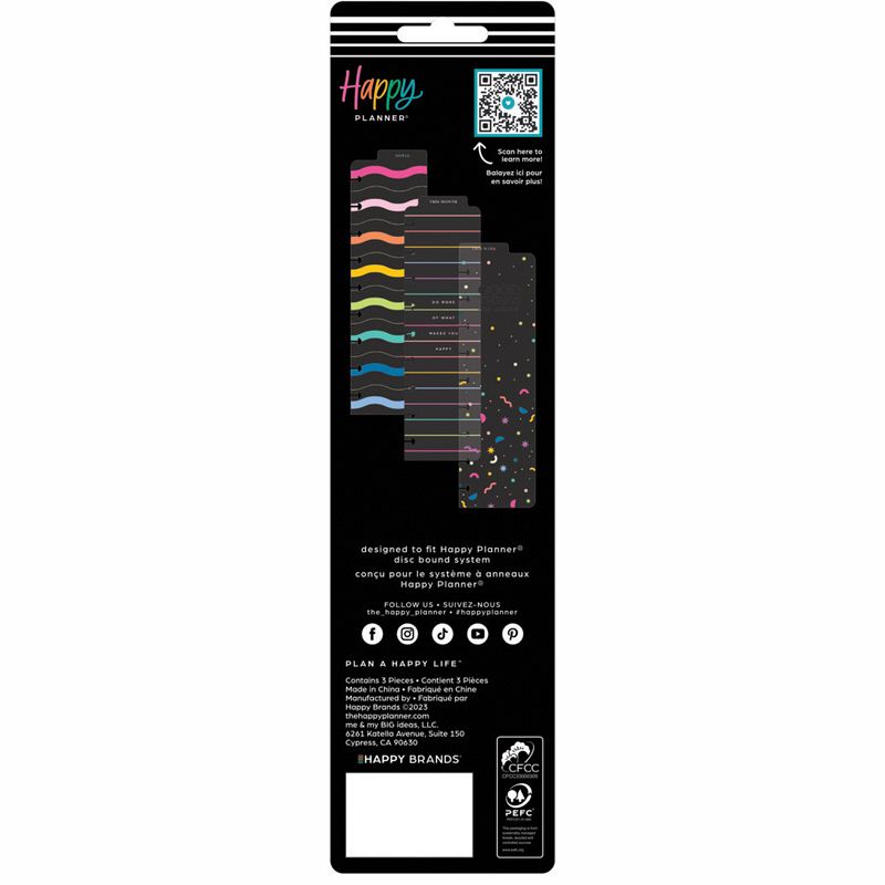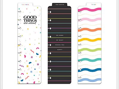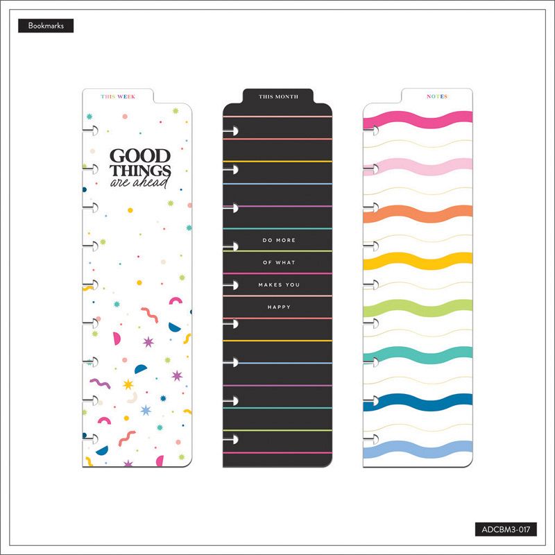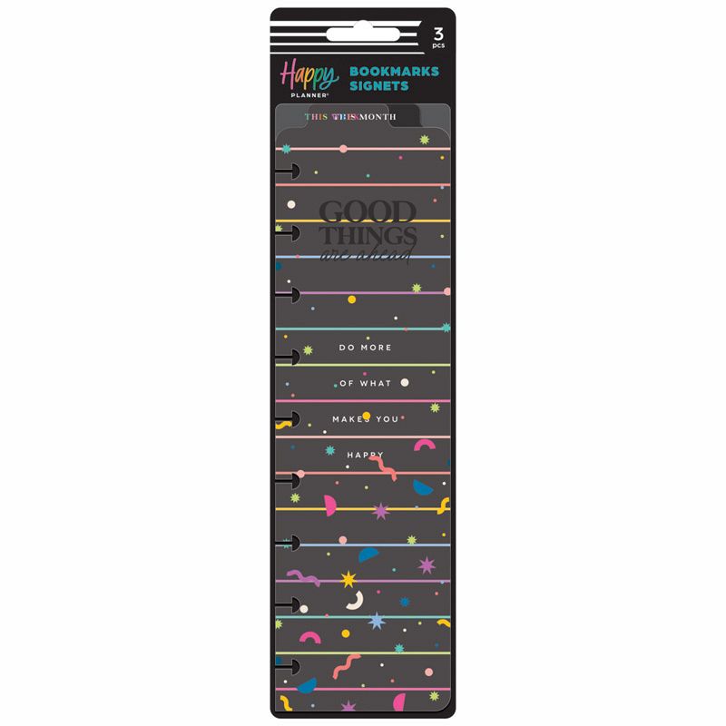 Turn to the right page every time. These Classic size Happy Brights planner bookmarks will help you categorize and divide your planner or keep your spot. These bookmarks come in a 3 pack with different bookmark designs and includes a top tab for easy access. Easily snap them into your Classic Happy Planners or journals and notebooks using the disc bound system.