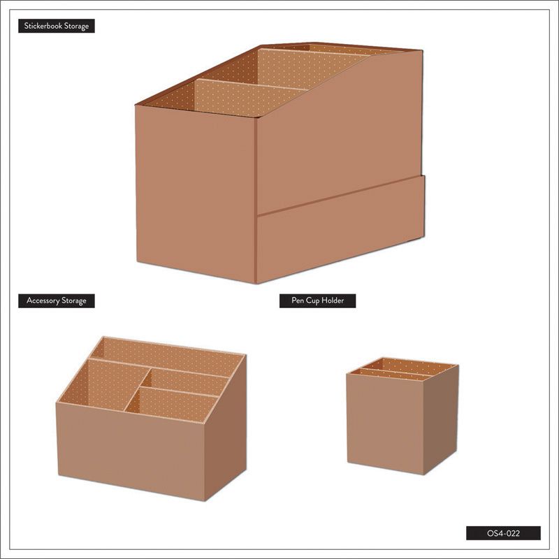 Organize your favorite planning essentials with this Tan Woven sticker book accessory and pen cup storage box kit. Complete your stylish desk setup with this simple tan color and polka dot interior. Our New sticker storage boxes have swapped out adhesive for snaps for a secure closure fastening system. Use the 9 total compartments to find the perfect place for your office and planning supplies. This set will add a bit of interest to your desktop and creative space.