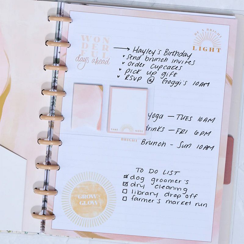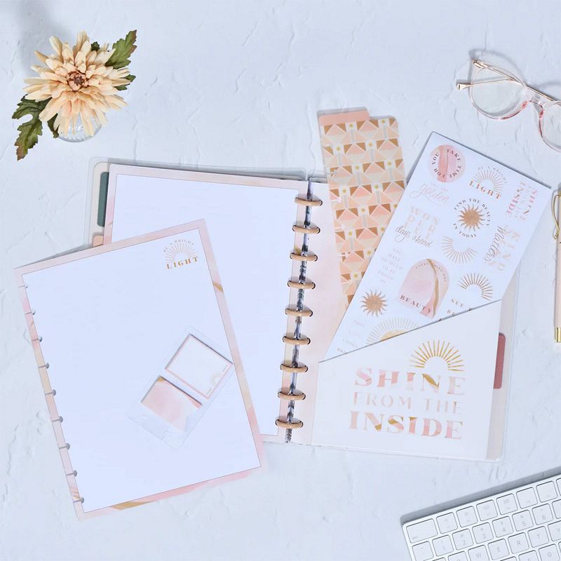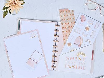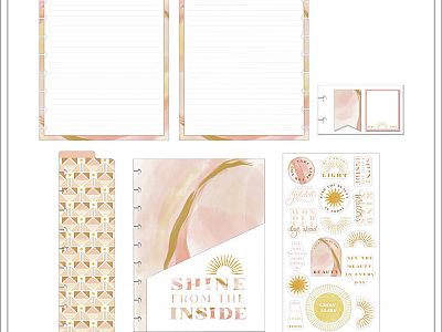 This Golden Hour themed Classic Happy Planner Accessory Pack features a theme inspired by early mornings and the onset of the evenings. It includes planning accessories like a pocket folder and sticker sheet with sticky notes a bookmark and filler paper. Add these Golden Hour themed planning accessories into your Classic size Happy Planner and notebook or journal and bring more utility to your everyday planning. These planning accessories fit into Classic size Happy Planners and snaps in easily with the disc bound system.