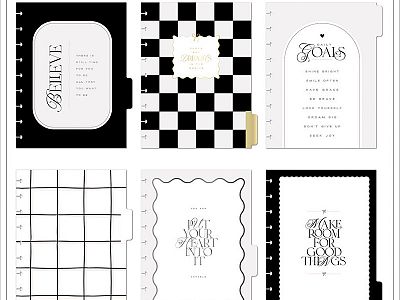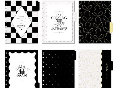 This planner design features a black and white color scheme with gold foil accents and motivational quotes.