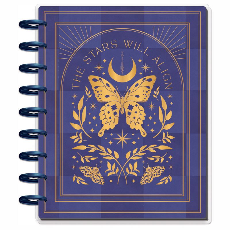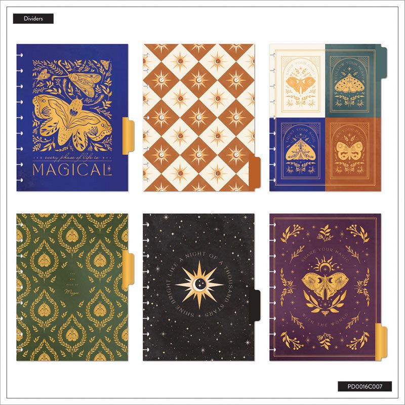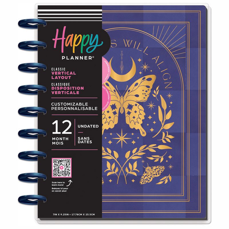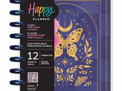Shine bright as the stars with this Share Your Magic with this aesthetic undated Happy Planner. This Classic size vertical planner is had 12 dividers with gold foil accents and moons and stars and features artful butterflies and moths. Keep yourself organized any time of year and start whenever you need to with the weekly undated spreads. Use the provided labels to set up your dividers and plan another year of goals that align with your aspirations.