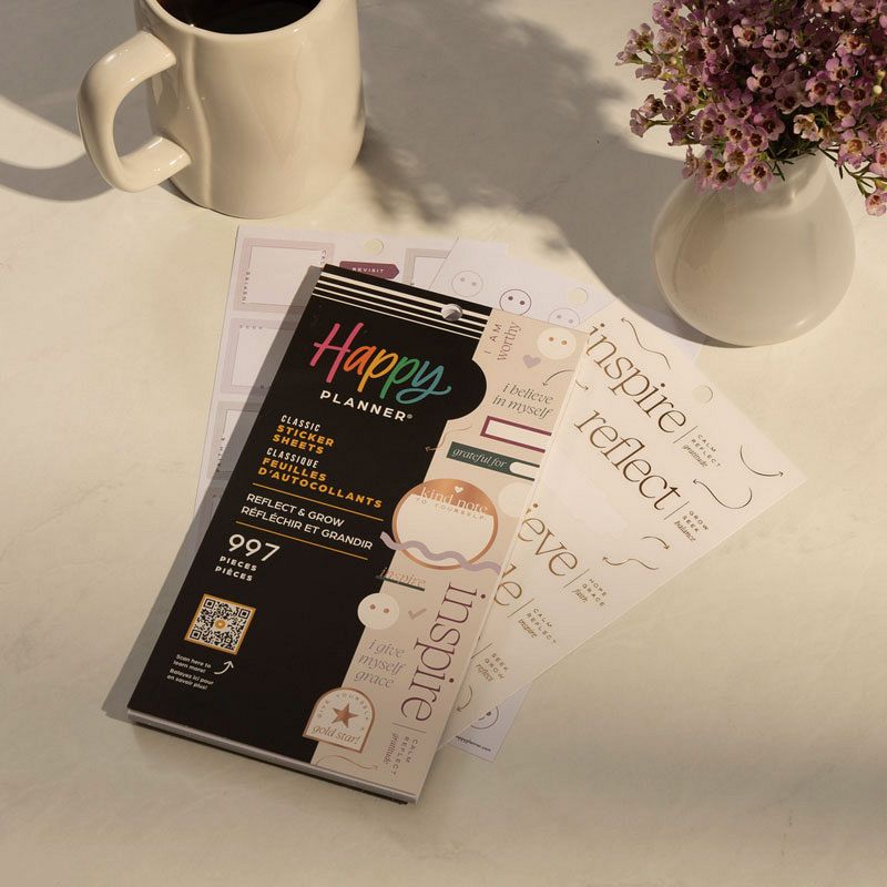This Reflect and Grow sticker book features tools to remind you to take a look at how far you have come. Expand the use of your planner or notebook spreads and take notes and decorate your layouts. Add reminders for gratitude or faith and aspirations. Use the memo boxes for quick notes or exercises in grow. Add these to any Classic size Happy Planner or notebook and keep planning creative.