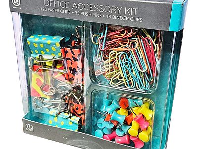 • This office accessory value pack features a variety of small and medium sized binder clips and medium paper clips and assorted color push pin tacks.