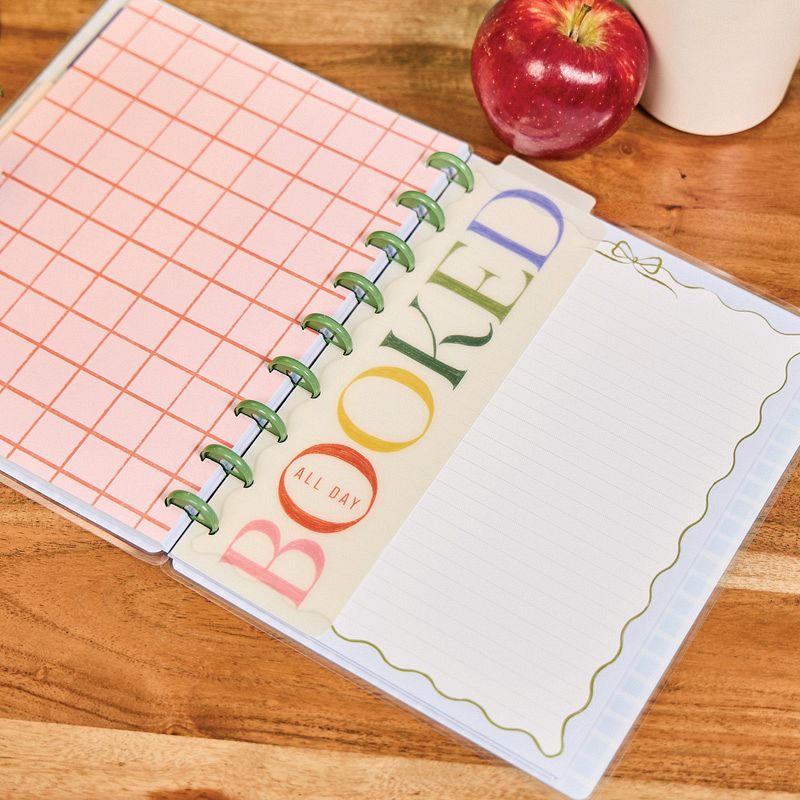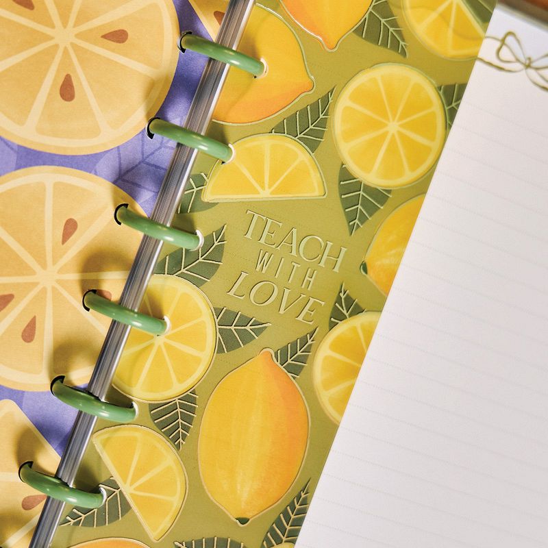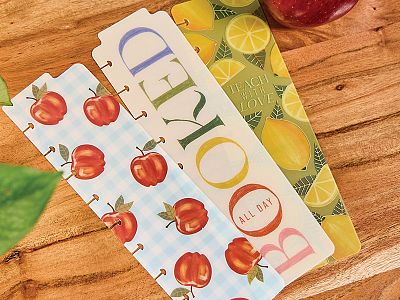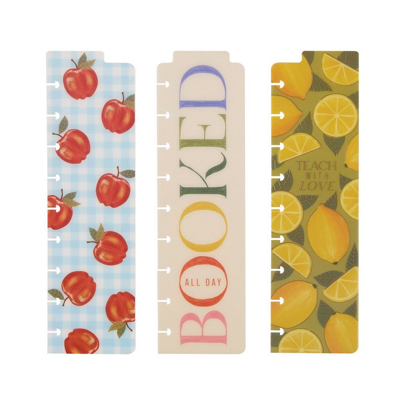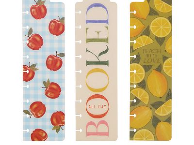 These bookmarks are colorful with teacher inspired designs. Includes red apples on gingham, citrus lemons with Teach with Love, and a bold Booked All Day rainbow design. Easily mark your spot in any classic size happy planner.
