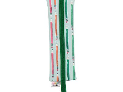 • 1 slim zippered pen pouch with gold tone hardware and a bright green zipper pull