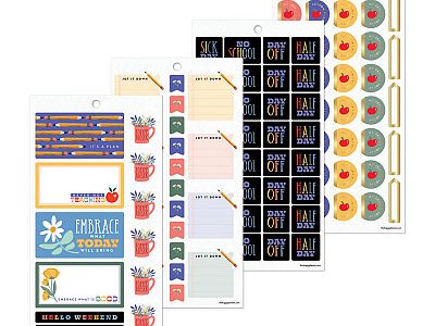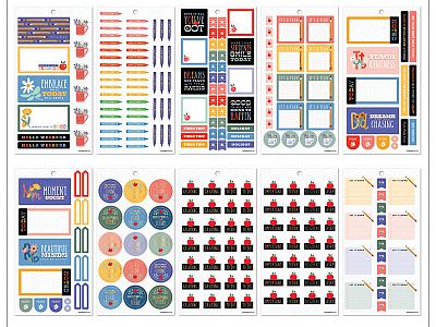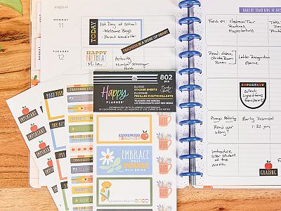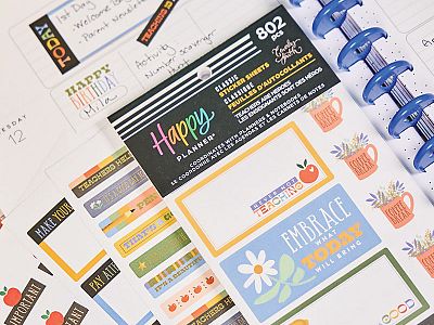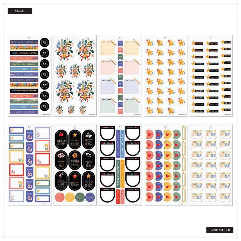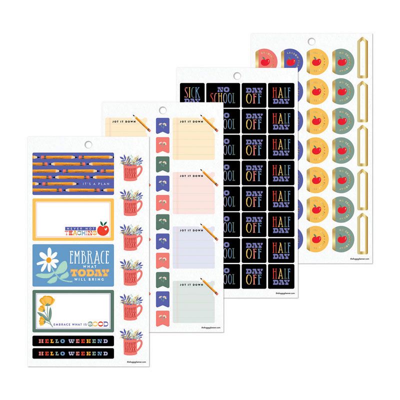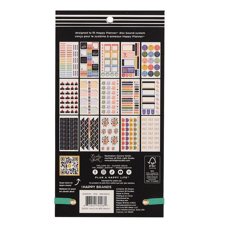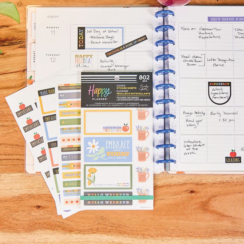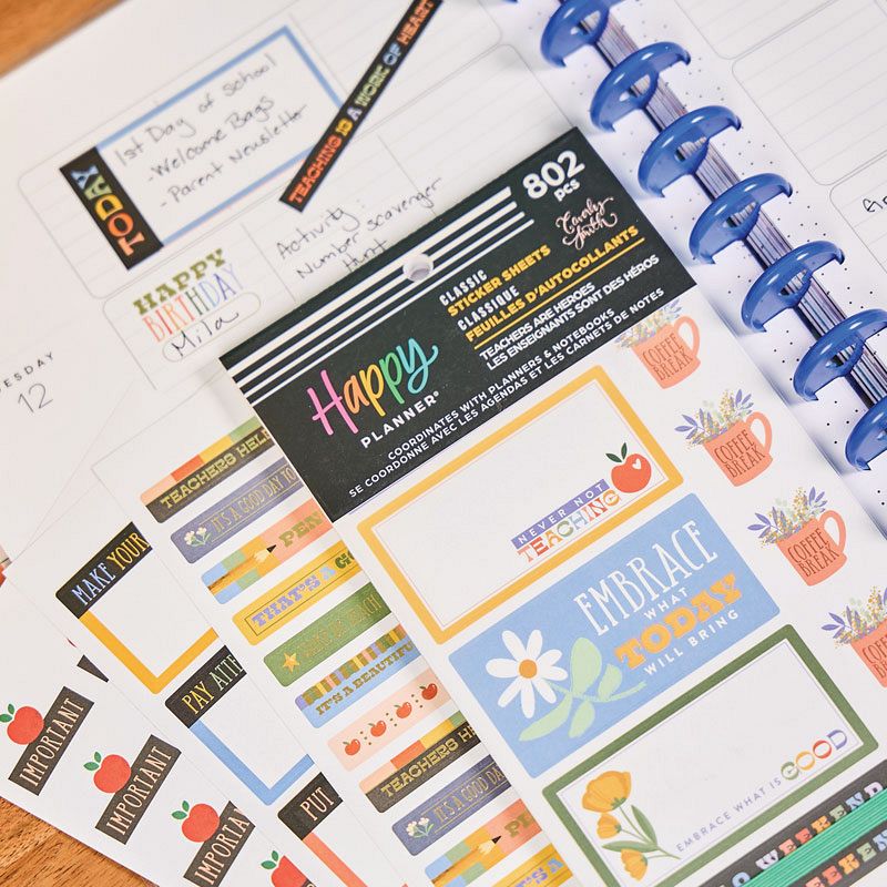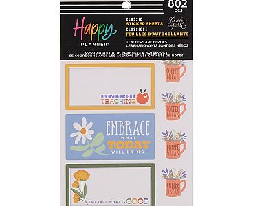 This 30 sheet sticker pack includes 802 matte and clear stickers designed to fit Classic size Happy Planners. Featuring artwork by Cavery Smith, itâs filled with motivational quotes, icons, and functional labels making it perfect for lesson planning, grading, scheduling, and staff meetings.