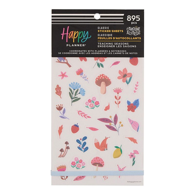 This seasonal sticker pack includes 895 stickers designed by Caroline Alfreds, featuring spring, summer, fall, and winter themes. With teacher friendly icons, reminders, and nature inspired decor, these Classic size stickers are perfect for adding style and organization to any planner or notebook.