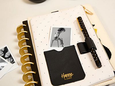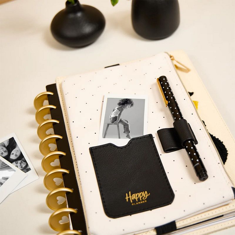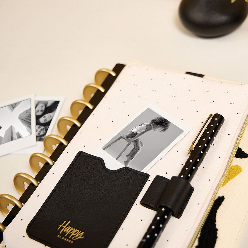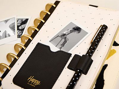Metallic gold zip detail with a Happy Planner label flag