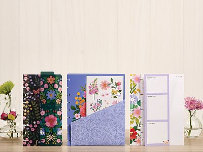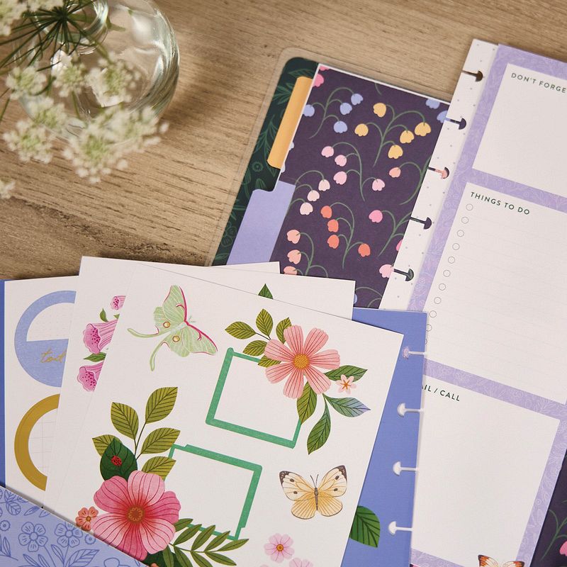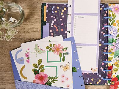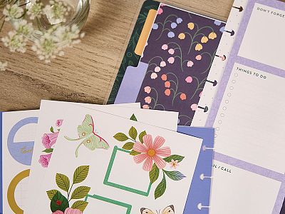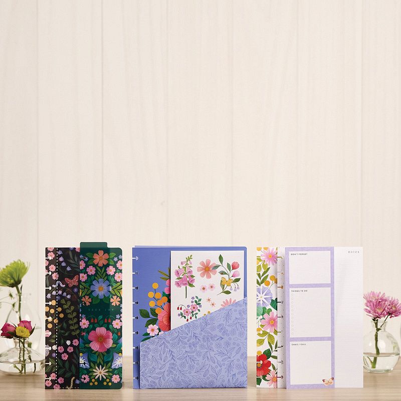 Designed with a floral theme from Paper Raven Co., this Midnight Meadow Classic Happy Planner accessory pack features bright blooms and rich colors. It includes a pocket folder, dot grid and folded filler paper, a bookmark, sheets of flower stickers, and an envelope. Add these floral themed accessories into your Classic size Happy Planner, notebook, or journal to bring more utility to everyday planning.